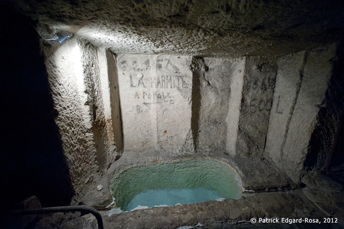 Les découvertes ne s’arrêtent pas là, il ya les sources naturelles, les puits ça et là. Je parcours en leur compagnie les 2 à 3 kilomètres de galeries utilisés pour finalement découvrir “la marmite à popol’ remplie d’eau bleue, clair, limpide remplie de calcite. Vision décalée de thermes romains ou d’un antique jaccuzzi? non, il s'agit en fait d'une source “pétrifiante” de laquelle s’échappent d’interminables tuyaux qui s’enfoncent dans les galeries : cela permettait à l’époque d'arroser les cultures de champignons.