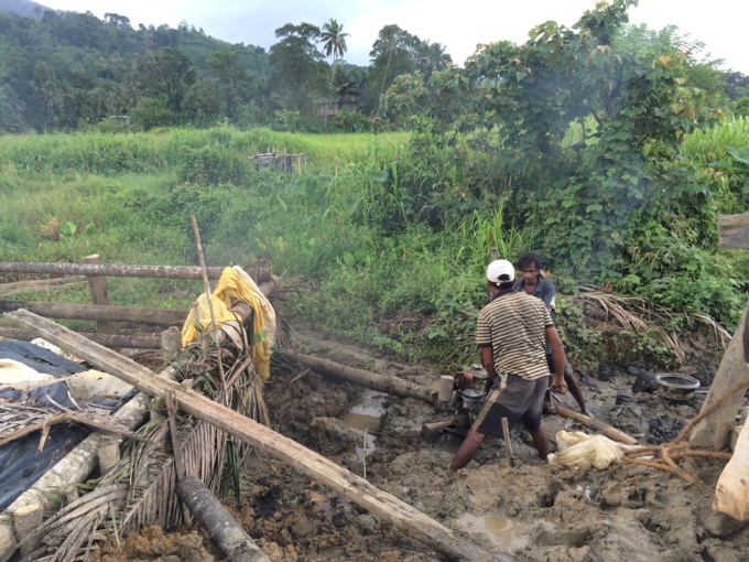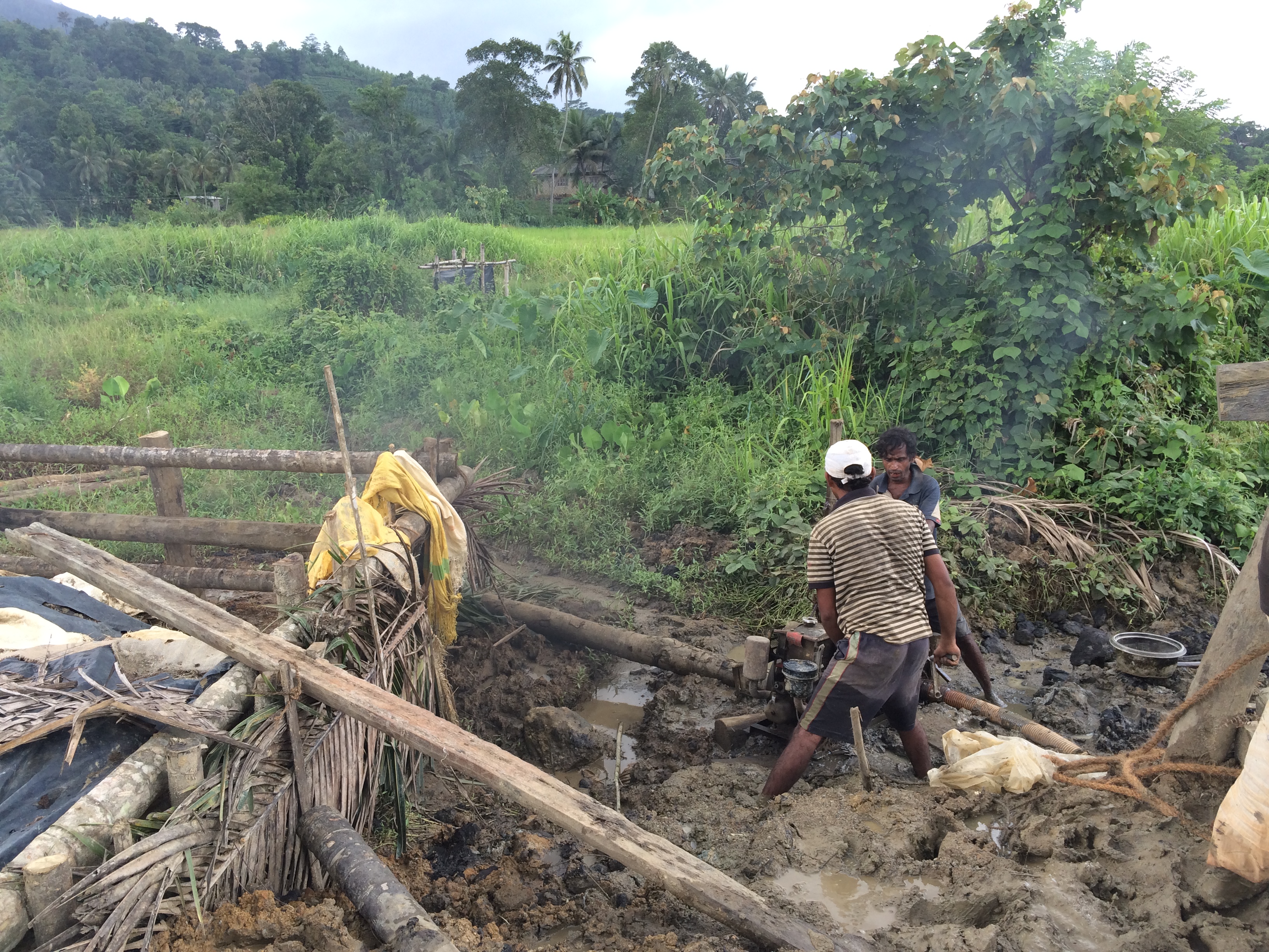 Pas besoin de permis. Vous pouvez creuser librement, d’où les nombreux puits de mine disséminés dans le paysage de rizières. D’une profondeur d’une trentaine de mètres en moyenne, ils peuvent descendre jusqu’à 50 mètres. Creusés à la main et étayés avec des poutres, ils font vivre d’espoir de nombreux paysans. Le gravier tiré de la mine est ensuite passé au tamis, et là c’est parfois le jackpot, mais au prix d’un travail harassant et dangereux. Attention aussi aux serpents venimeux qui courent dans les eaux troubles… Il faut commencer par écoper le puits chaque jour avant de descendre au fond. A la saison des pluies, impossible de travailler. Il faut prendre son mal en patience.