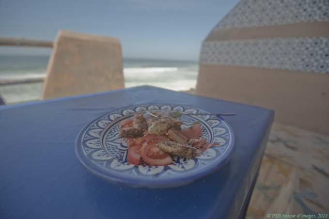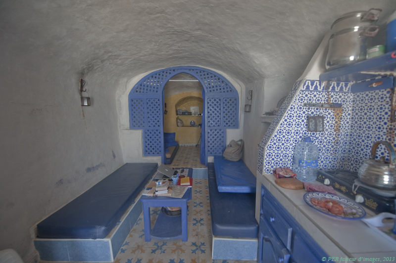 Sur la droite, le coin cuisine tout de bleu vêtu, est résolument pratique, sans fioritures : double plaque à gaz, eau courante. Une citerne enterrée sur le dessus de la grotte à même le coteau, d'une contenance de 1 000 litres, peut être alimentée par tracteur-citerne, livrable dans la journée (environ 300 dirhams). Vive les douches vivifiantes à peau froide… dans les toilettes-douches discrètement intégrées dans une petite pièce qui jouxte notre terrasse.
