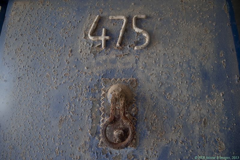 La double porte blindée fortement rouillée porte le n° 475. (L'identification de la grotte, enregistrée dans les services de l'Etat est une bonne chose…) Elle s'ouvre sur deux pièces successives, voûtées d’environ 12 et 8 m2. Ce n'est pas toujours le cas, d'autres grottes ont été bétonnées style bunker et offrent des volumes cubiques. Nous retrouvons ici un peu du style andalou ou grec : de petits intérieurs compacts sans perte d’espace. Inutile de vous dire que le temps des laves linges et frigo-congélateur est … révolu ! De toute façon, pas de courant électrique, je n'en vois d'ailleurs pas trop l'utilité. Bon admettons, on n'arrête pas le progrès : il sera toujours temps d'installer la fée électricité par l'entremise d'un panneau solaire (coût non négocié, 15OO euros ttc).