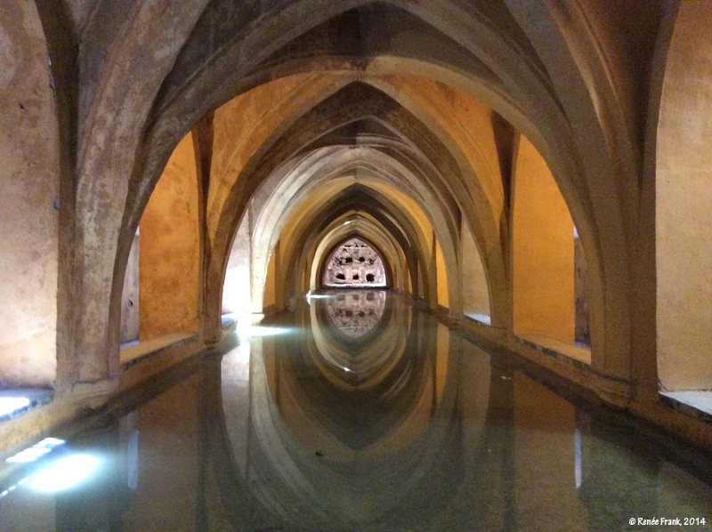 Lieu mythique où je rêvais de déambuler, de me perdre dans les innombrables jardins aux noms les plus évocateurs : jardin du Prince, jardin de la Galère, jardin de la Danse, jardin de l'Etang de Mercure, jardin des Poètes, jardin de l'Alcôve, jardin du Labyrinthe et tant d'autres encore... Fontaines et végétation, canaux et bassins apportent la fraîcheur dans la canicule de l'été. Malgré l'émerveillement des lieux, me voici épuisée par cette longue promenade sous 40° de soleil andalou. C'est alors que je découvre sous le Palais, près de l'étang de Mercure, une ouverture mystérieuse, qui crée un appel d'air frais, dans lequel je m'engouffre avec délice. C'est au bout de ce tunnel sombre que je découvre une piscine souterraine aux proportions d'une grande harmonie.