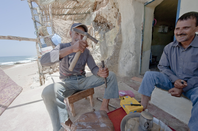 Abdallah a 60 ans, le visage buriné par le sel et la mer : 44 ans de séjour au bord de la plage et 300 grottes creusées à son actif. Un petit homme sec et souriant, ancien athlète qui soigne ses rhumatismes dans le sable chaud. C’est notre guide Lahocine qui nous emmène prendre le thé chez son ami. Les grottes sont ici à un faible niveau au-dessus de la mer, à la différence des falaises d’Aglou, le repaire des Trogs. La cabane cimentée qui abritait les toilettes a été emportée l’hiver dernier par la tempête. Difficile d’imaginer la mer déchaînée en ce bel après-midi de fin de printemps : le vent souffle ici moins fort qu’à Aglou et le sable blanc donne un caractère paradisiaque à cette crique bordée de grottes. Celles-ci ont des auvents souvent recouverts de filets de pêche. La cuisine est construite sur la terrasse et l’on prend ses repas à l’extérieur. Il faut dire que les grottes sont moins profondes et donc moins spacieuses qu’à Aglou (en moyenne 5,5m de long sur 2,60m de large contre 7 à 8m sur 4m de large).