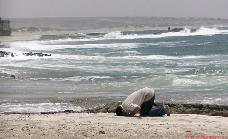 Voici venue l’heure de la prière. Sur la plage, point besoin de tapis de cérémonie. Un homme sur le sable accomplit les rites, agenouillé sur le sable. Un moment sacré, qui impose le silence. Puis Abdallah, sentant qu’il peut nous faire confiance, prend un air mystérieux de comploteur et propose de nous montrer une curiosité cachée sous des bâches à l’abri de la falaise : une grande baleine s’est échouée sur la plage il y a 2 ans. Les pêcheurs vendent aux touristes des vertèbres géantes qui sentent encore l’animal. Pour 400 dirhams, tu te fais une table originale, mais bof, c’est pas trop mon truc.