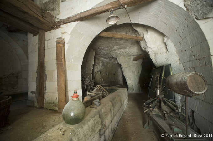 Les caves qui jouxtent la demeure seigneuriale s’enfoncent profondément dans le coteau sur plusieurs centaines de mètres et permettent de rejoindre une ancienne ferme située sur la commune voisine de Souzay. Un pressoir antique se dresse à l’entrée des caves. C’est probablement un des premiers souterrains que nous avons exploré avec notre ami Jean Goumain, une lampe tempête à la main, à l’époque où nous découvrions l’univers troglo. Si la lumière s’éteignait, nous pouvions tourner en rond plusieurs heures, à moins de suivre le sens de la taille de la roche, censée nous ramener au point de départ. Mais nous comptions surtout sur le chien Igor pour guider nos pas. Nous avons beaucoup de souvenirs au Marconay, comme celui d’avoir fêté les 50 ans de Monsieur Trog au milieu des cuves à vin… et après avoir franchi le porche menant aux antres de la terre.
