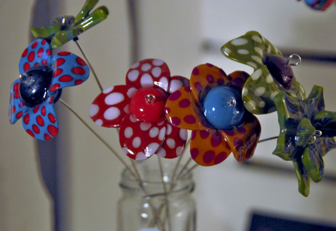 Fleurissez l'hiver !! Au café/librairie, les créatrices vous donnent le choix. Nadoz-Aer en céramique, La petite Fleur du Panier en céramique, Vert Piment en Pâte polymère, Anne Bernard en fleurs séchées.