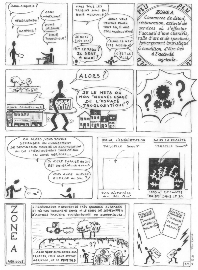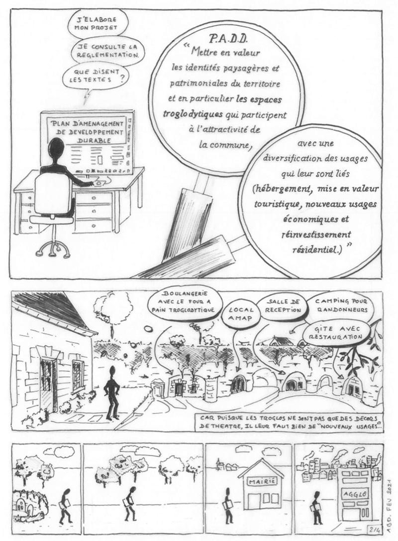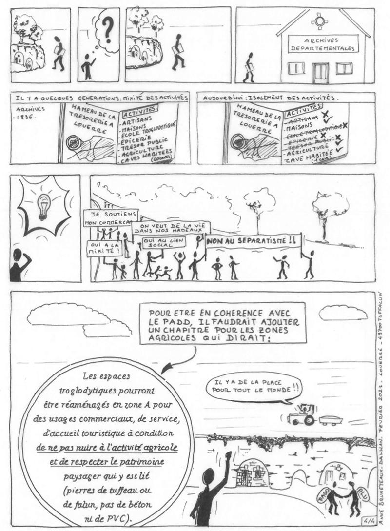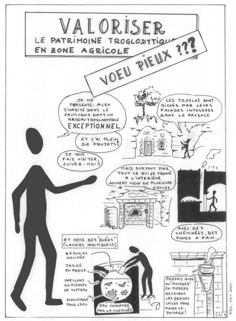 " Suite à l'enquête publique concernant le PLU (Plan local d'urbanisme) dans le Saumurois, nous avons voulu montrer par cette bande dessinée la problématique de la restauration de sites troglodytiques au niveau de la réglementation.
