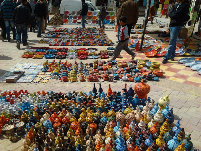 Petit bond de quelques 500 kms : nous sommes à la « porte du désert » à Tataouine (تطاوين), anciennement appelée Foum Tataouine. Simple relais sur la route des caravanes, de Gabès au Soudan, Foum (bouche)Tittawen (source) permet de découvrir aussi quelques villages berbères (ksours) avoisinants, accrochés aux sommets des collines dont les grottes ont été transformées en habitations troglodytiques. Ainsi Chenini, Guermessa et Douiret, ont été construits lorsque les berbères ont fui les plaines au moment des invasions pour se réfugier dans ces grottes.
