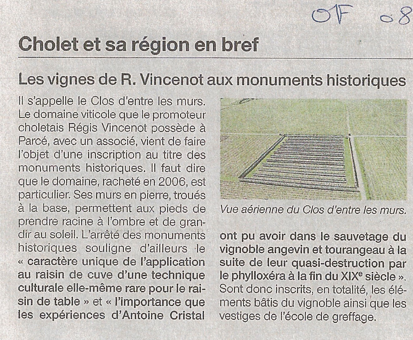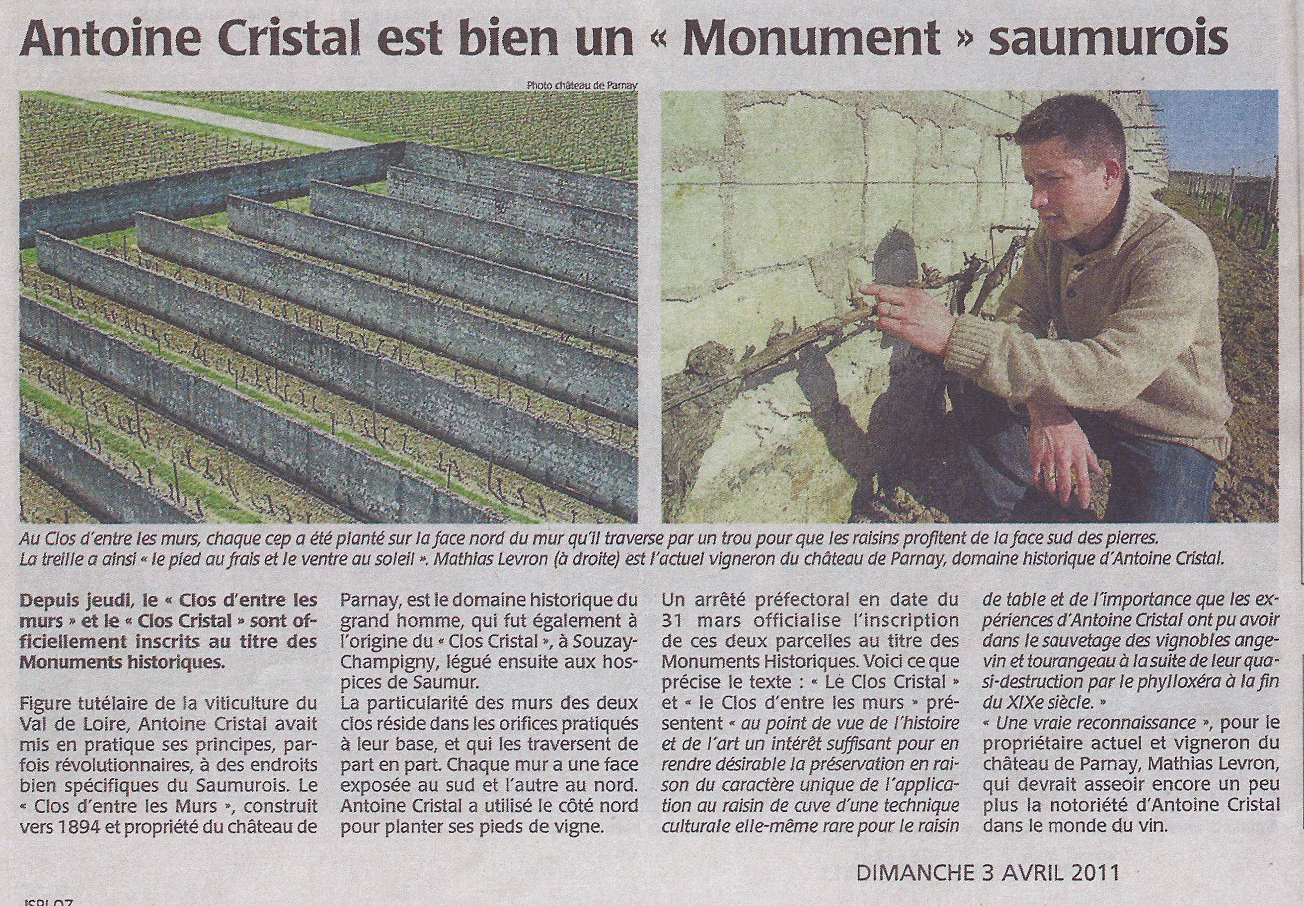 2. Dans les vignes du Père Cristal la mémoire a de l'avenir (Courrier de l'Ouest, 5 10 2009) 3. Le vin et la magie Cristal (Courrier de l'Ouest, 23 2 2011) 4. Entre les Murs (Courrier de l'Ouest, 22 9 2010) 5. A.Cristal Un monument (Courrier de l'Ouest, 03 4 2011) 6. Les Vignes de R Vincenot (Ouest France, 08 4 2011)